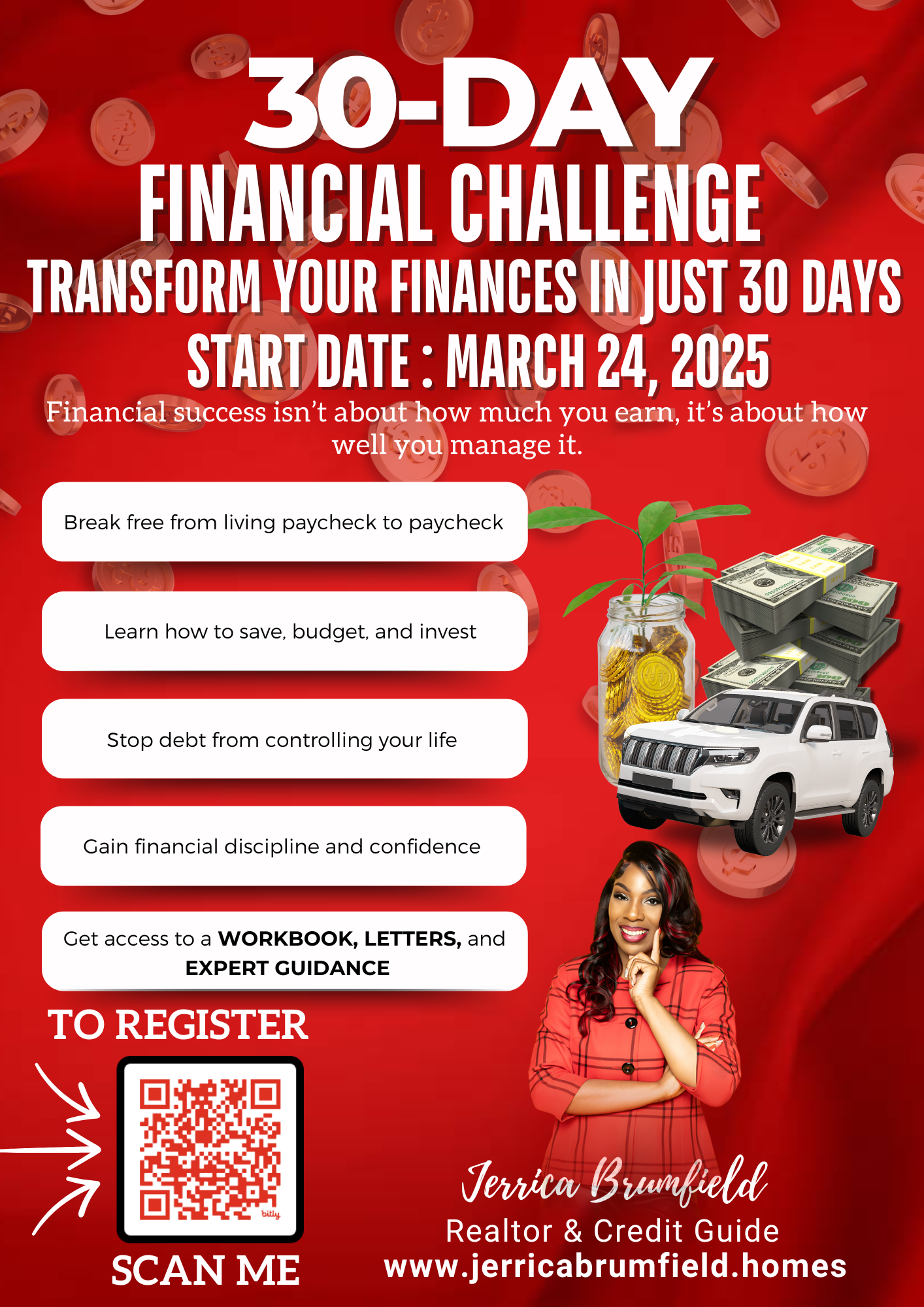 This interactive, results-driven challenge will give you the tools, knowledge, and strategies to take control of your finances. You WILL walk away knowing how to make extra money—and will have already made your investment back!